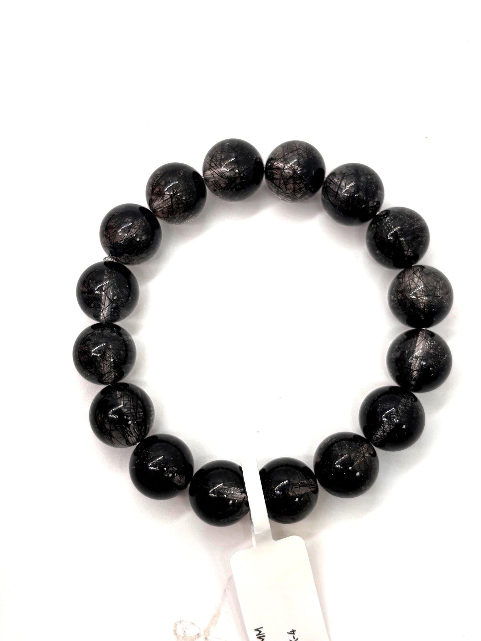 Black Rutile Bracelet • 12 mm Size • Code #BK-4 • AAAA Quality • Weight 43.7 gm • Natural Rutilated Quartz • Rutile Round Bracelet